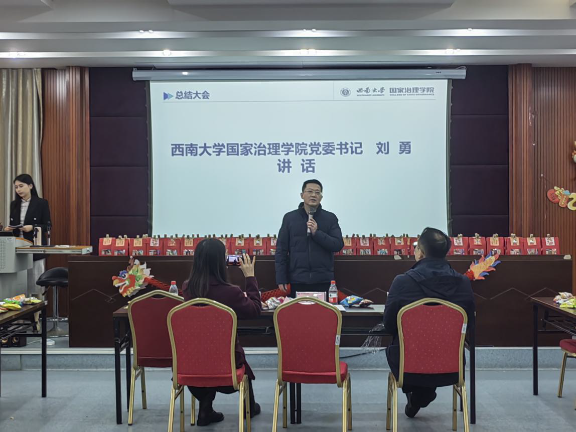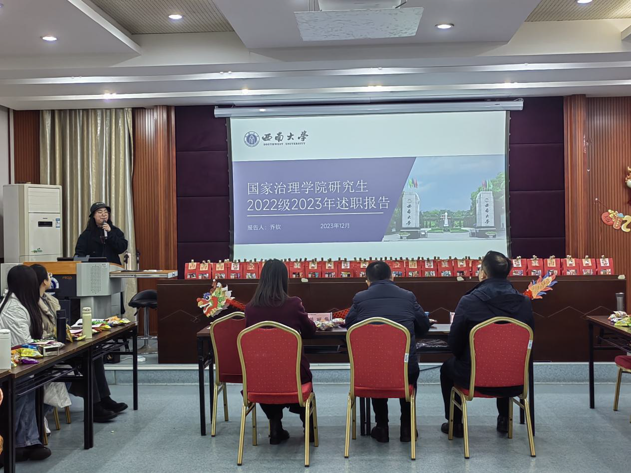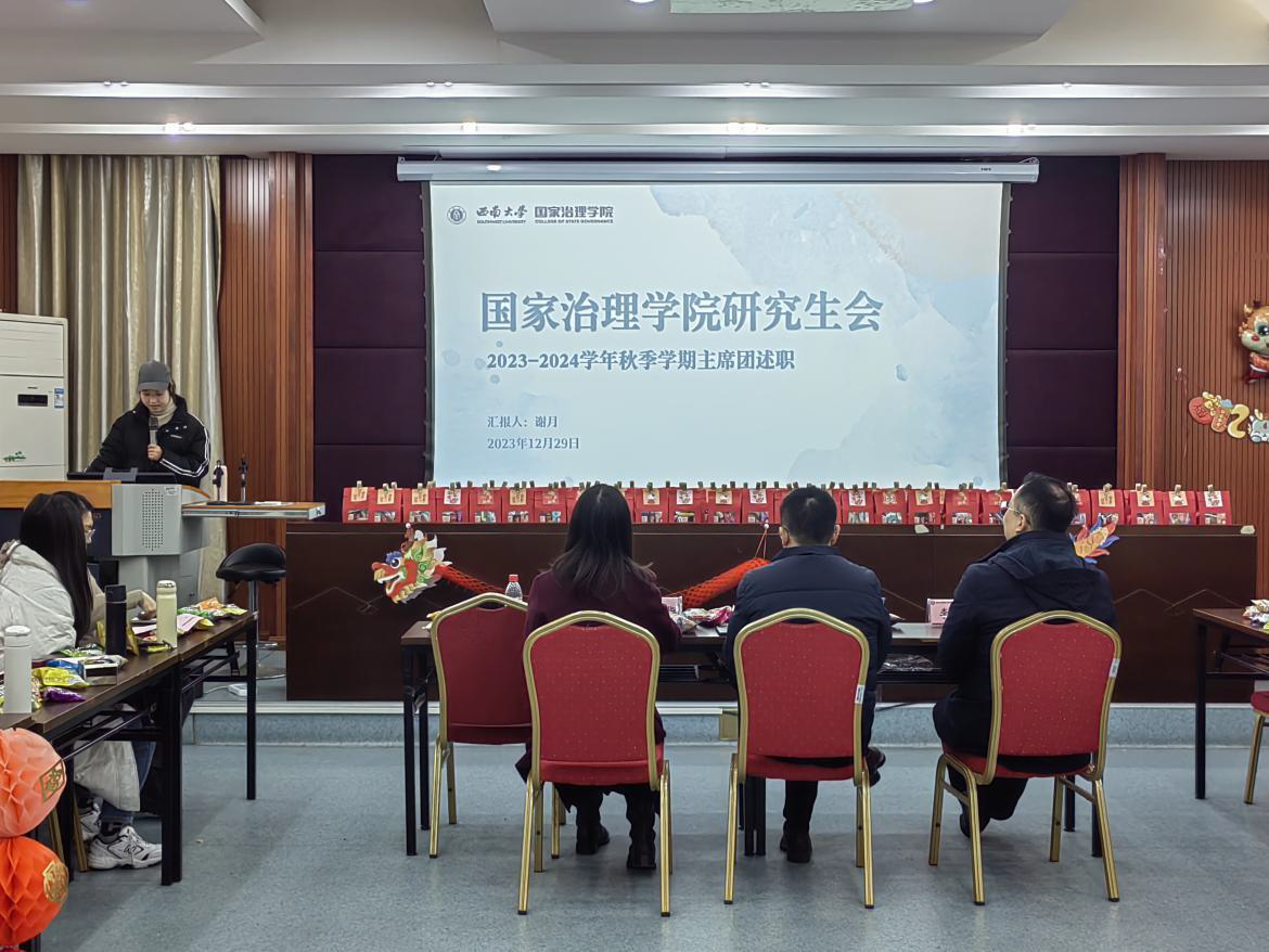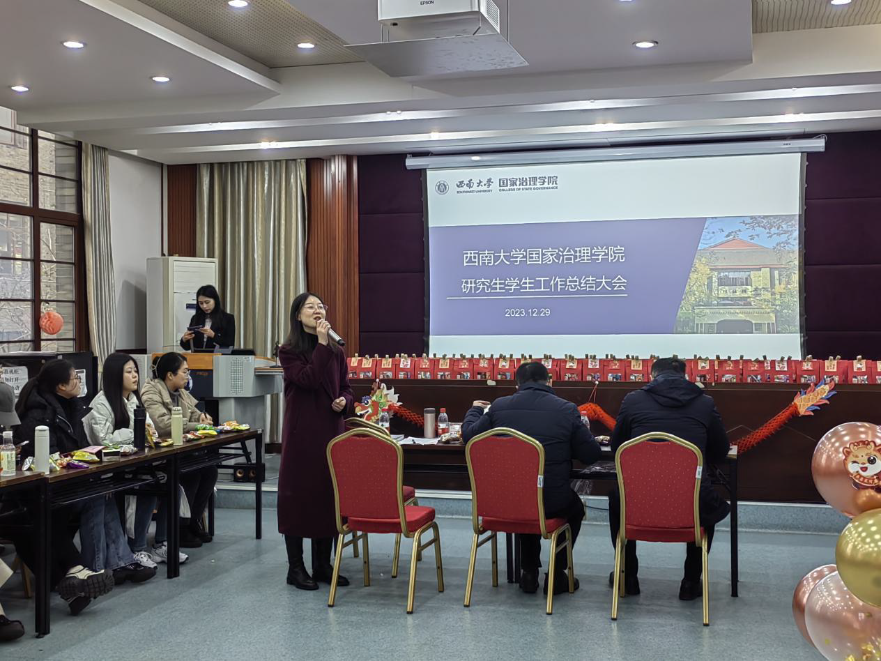 随后,2022级研究生年级长乔钦和2023级研究生年级长豆潘郭分别从日常工作、专项工作及专题工作等方面对2023年度员工工作进行回顾,反思工作中的不足,并总结归纳同学们提出的关于学习、生活等方面的意见和建议,对未来工作进行了展望。