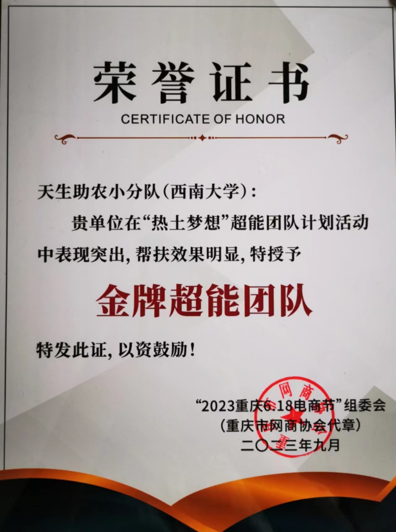 该计划是“2022重庆6.18电商节”电子商务助力乡村振兴活动的重要内容之一。公司组建的“天生助农小分队”经过激烈的角逐与热土心愿成功配对,成为50对梦想帮扶组合之一。经过一年对热土心愿的赋能帮扶工作的开展,天生助农小分队在9月14日的表彰活动中被授予“金牌超能团队”称号。据悉该称号共有8个团队获得。