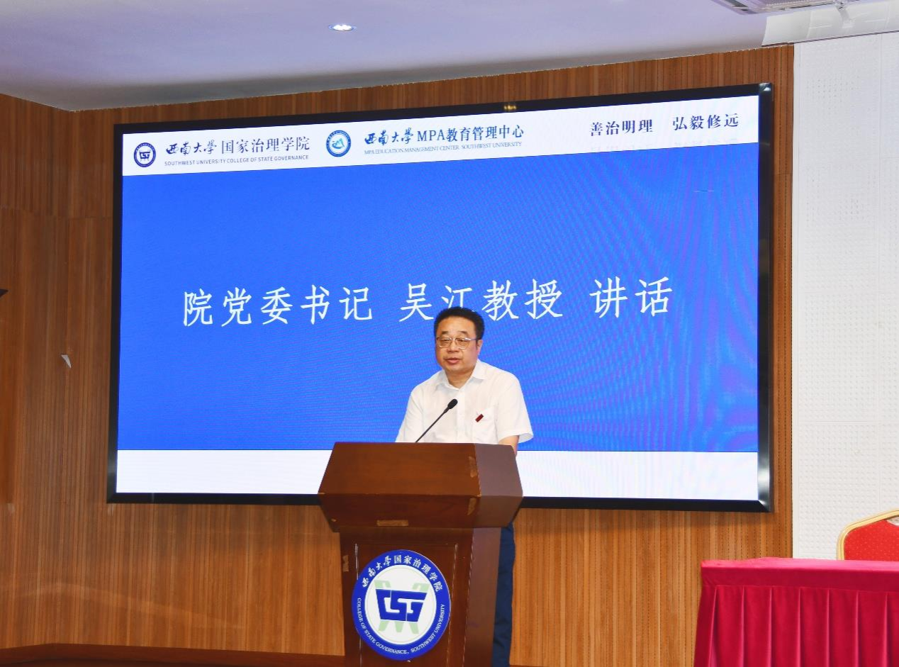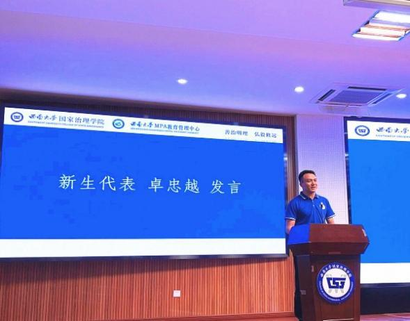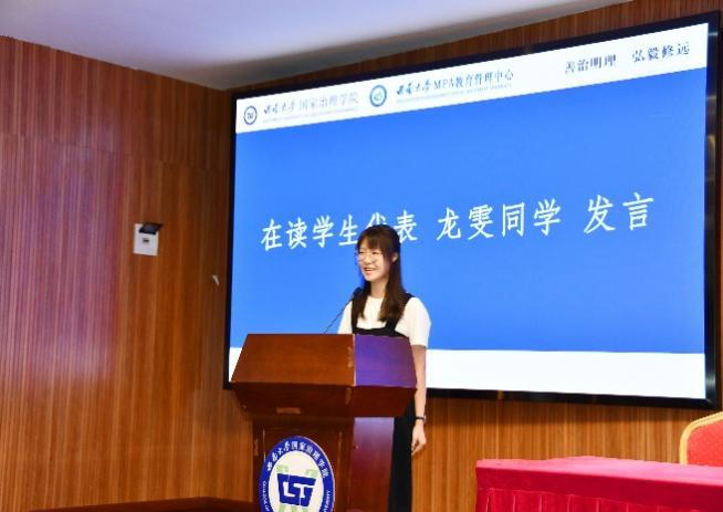 随后,2022级MPA在读员工代表龙雯同学、2023级MPA新生代表卓忠越同学依次发言。龙雯同学作为学习委员,分享了在校学习经验,启迪大家平衡好工作与学习的关系、把握好学习的节奏。卓忠越同学阔别公司16年,再次踏入熟悉的西大校园,他鼓励大家永葆“初心不与年俱老,奋斗永似少年时”的朝气,做虚怀若谷、竞争友爱的向上青年。
