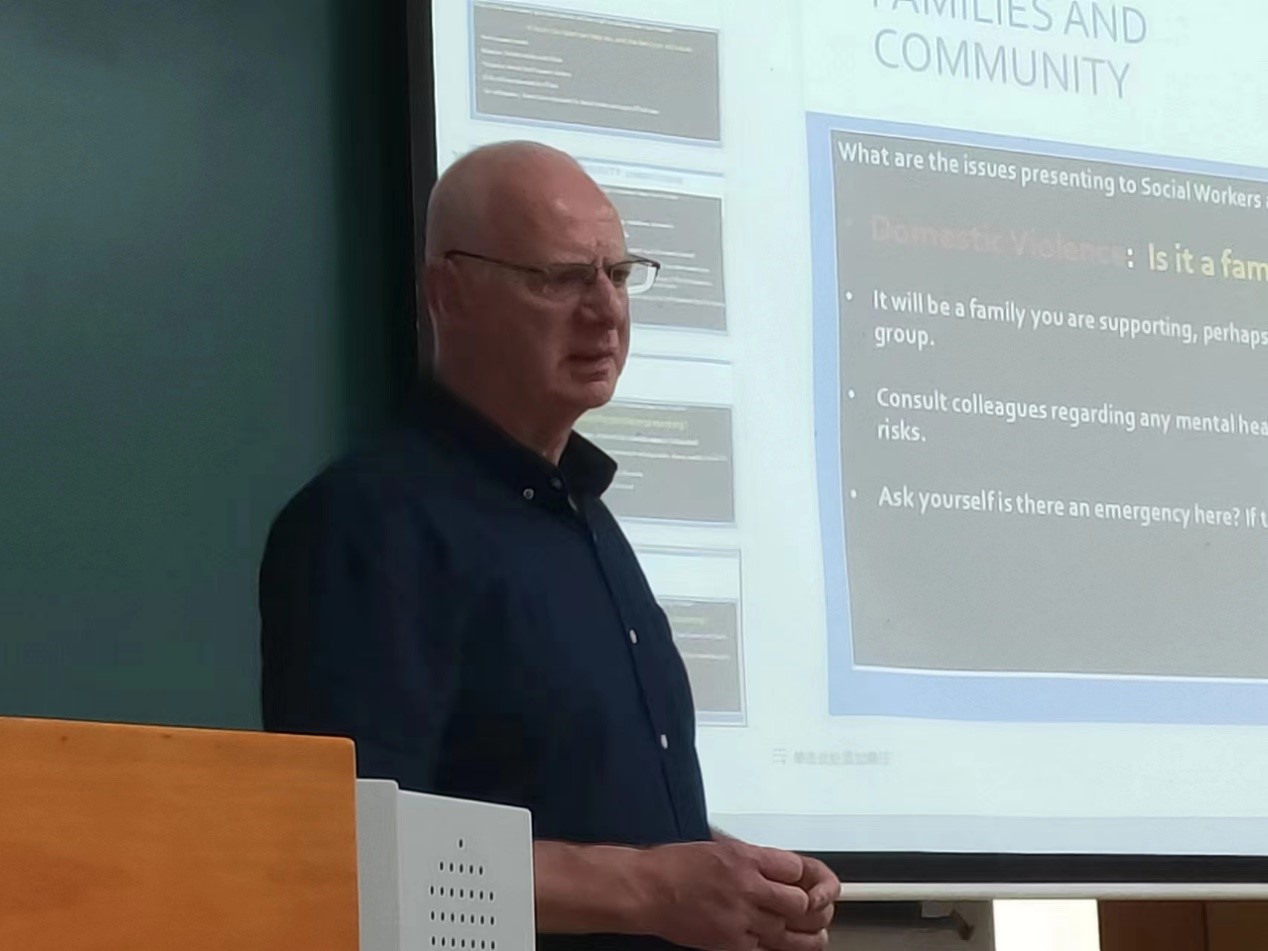 Des Mooney教授同时也对比讨论了社会工作如何介入青少年问题的干预,带领同学们对中西方的处理方法以及社会工作者发挥的作用进行了国别比较。在为期两周的课程中,同学们多次以小组的形式对社会问题进行了讨论和汇报,对提出的各类社会问题结合课堂中所学的理论进行了分析。