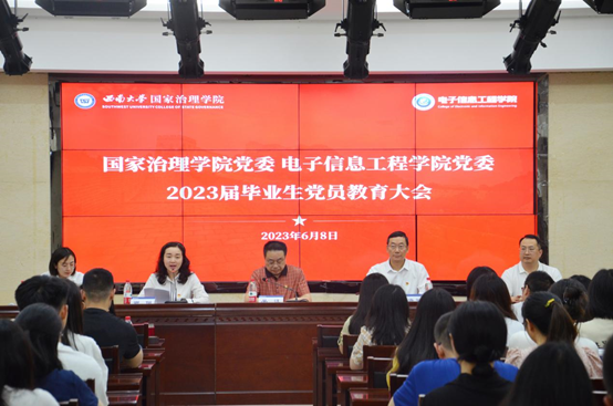 大会在庄严的国歌声中拉开序幕。电子信息工程公司党委书记熊海灵作动员讲话,他对毕业生党员在离校前参加党性教育提出三点要求,一是要强化理论学习,加强党性修养;二是要发挥示范作用,带头遵守公司规章制度;三是要脚踏实地,常学习、深思考、勤实践。同时,他寄语毕业生党员,希望大家成为追求理想、不负时代的追梦人;成为追求卓越、务实创新的西大人;成为追求文明、胸怀天下的中国人。