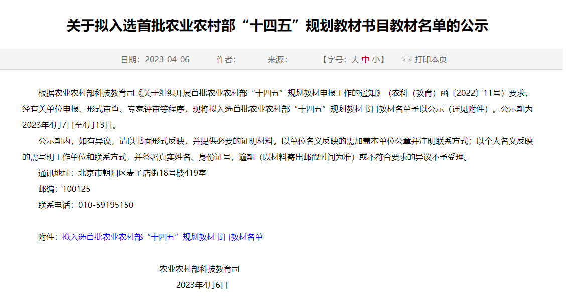 发布时间: 2023-04-07 11:29:49 已阅读:2023年4月6日,农业农村部科技教育司发布《关于拟入选首批农业农村部“十四五”规划教材书目教材名单的公示》,公司4部教材成功进入首批农业农村部“十四五”规划教材书目教材名单。