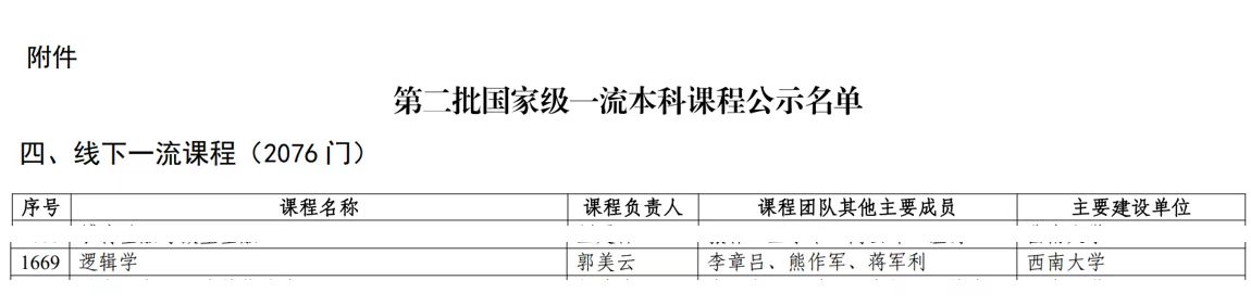 发布时间: 2023-04-12 10:05:38 已阅读:2023年4月11日,教育部高等教育司发布《关于第二批国家级一流本科课程认定结果的公示》,公司郭美云教授负责的《逻辑学》课程被认定为第二批国家级一流本科课程(公示)。