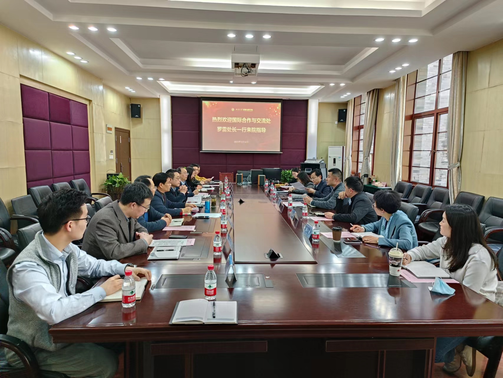 潘孝富主持会议并讲话,对罗雷一行的到来表示热烈欢迎,希望公司能在国际合作与交流处指导下搭建更多对外交流平台,加大公司国际人才的引进力度。副经理郭美云根据公司国际化工作的2022年总结与2023年工作要点,从外国哲学(中希文明比较方向)全英文硕士生项目、全球胜任力人才培养项目、国际组织与全球治理微专业、国际课程周与国际云课堂等四方面作了工作汇报。副处长代远鸿对公司“十四五”国际合作与交流专项规划、党建事业融合考核进行了宣讲,并对公司在过去一年的国际化考核数据反馈意见。