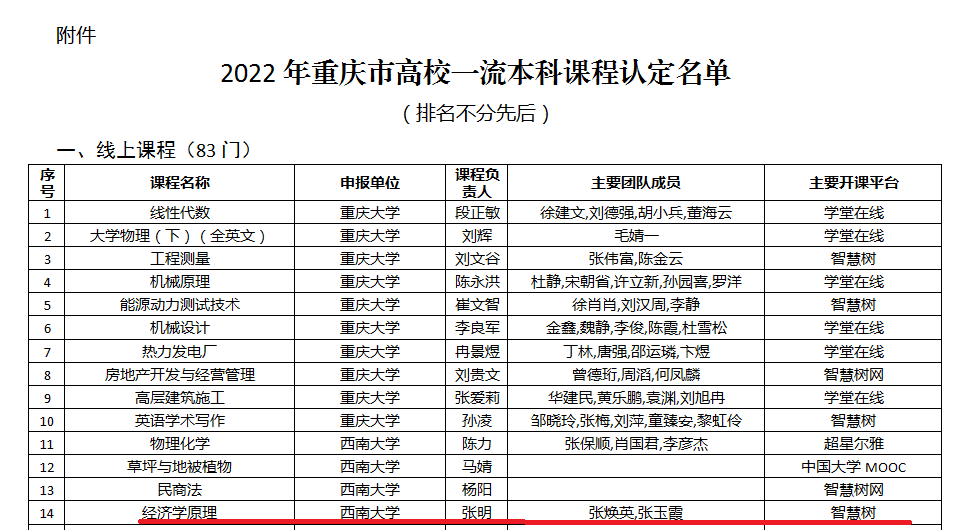 发布时间: 2022-12-29 18:32:55 已阅读:近日,重庆市教育委员会发布《关于公布2022年重庆市高校一流本科课程名单的通知》,公司《经济学原理》课程入选2022年重庆市高校一流本科课程线上课程认定名单。这是公司连续三年获得重庆市教育委员会认定的一流本科课程,公司通过稳步推进一流本科课程建设逐步夯实一流本科专业建设基础。