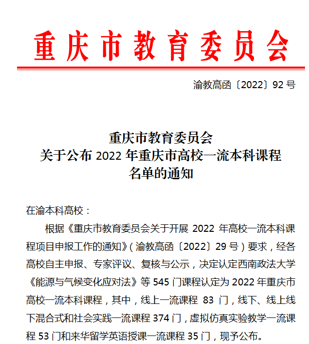 公司1门课程获重庆市高校一流本科课程