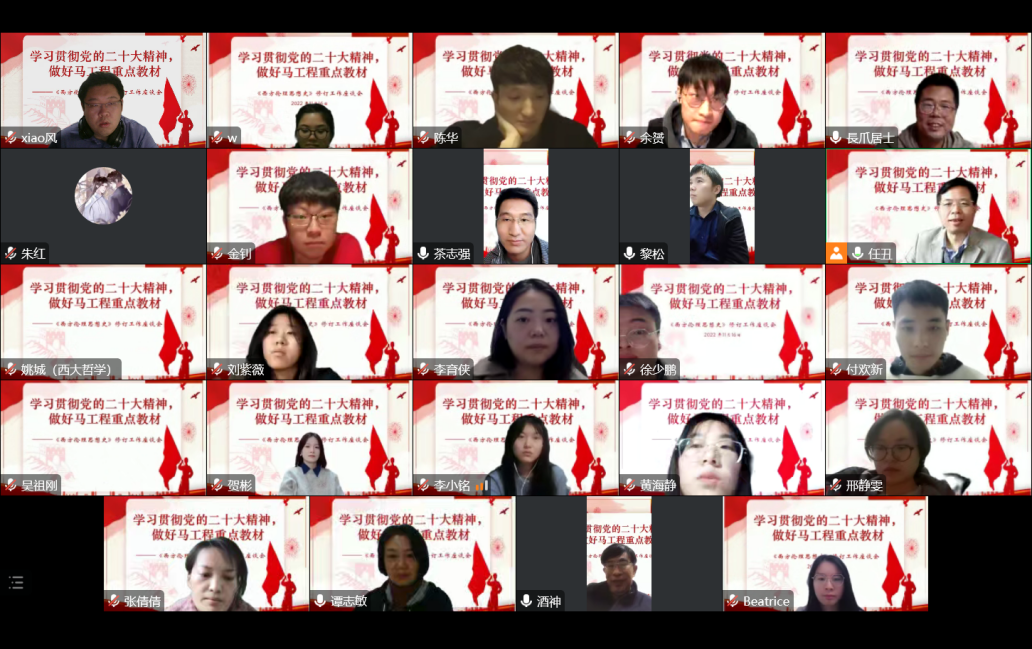发布时间: 2022-11-23 13:47:56 已阅读:11月22日马克思主义理论研究和建设工程重点教材(以下简称“马工程”教材)《西方伦理思想史》(bevictor伟德负责部分)修订工作启动会以视频会议方式在云端举行。bevictor伟德哲学学科负责人任丑教授,岳跃副教授、谭志敏副教授、吴祖刚副教授、黎松副教授、姚城副教授以及伦理学全体硕博士生与会,就马工程教材《西方伦理思想史》(bevictor伟德负责部分)修撰工作做了研讨与交流。伦理学教研室主任王俊杰副教授主持会议。