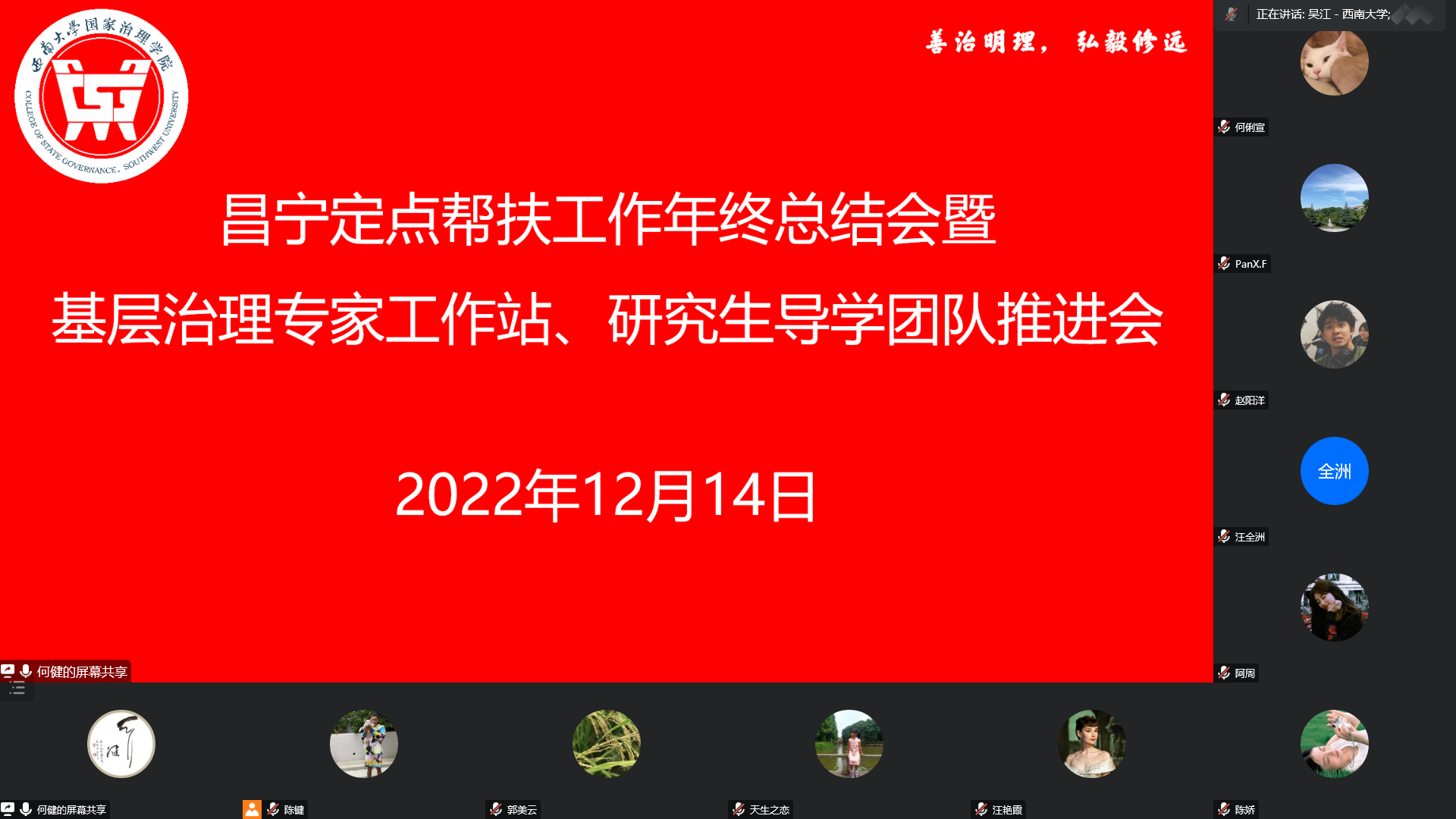 发布时间: 2022-12-15 17:35:34 已阅读:12月14日,公司召开昌宁定点帮扶年终总结会暨基层治理专家工作站、研究生导学团队推进会。会议由伟德体育副经理何健主持,公司经理潘孝富教授、项目负责人吴江教授,以及相关领导、老师和研究生志愿者同学参与会议。