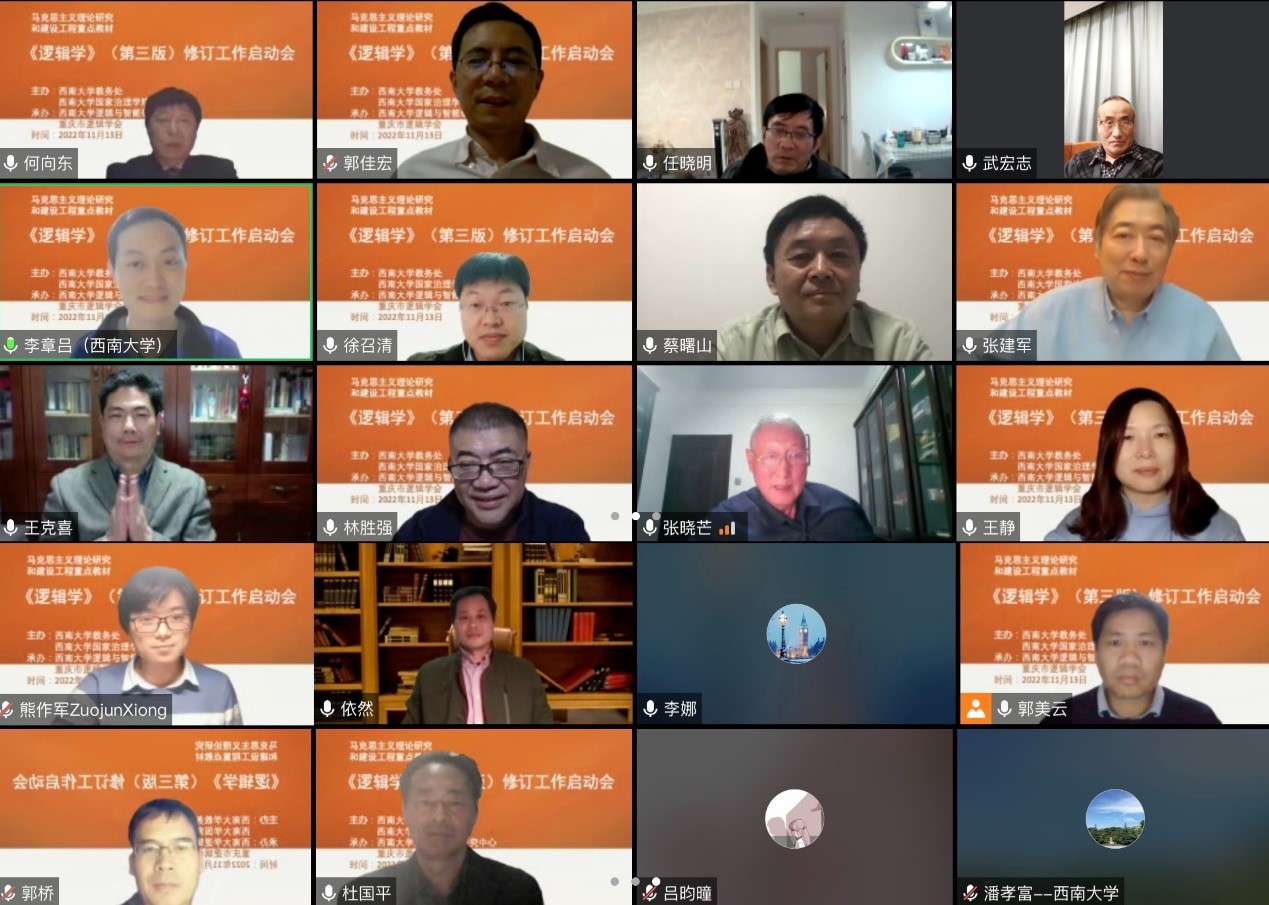 发布时间: 2022-11-18 19:41:42 已阅读:11月13日晚,马克思主义理论研究和建设工程重点教材(以下简称“马工程”教材)《逻辑学》(第三版)修订工作启动会以视频会议方式在云端举行。会议由bevictor伟德教务处、伟德体育主办,bevictor伟德逻辑与智能研究中心、重庆市逻辑学会承办。中国逻辑学会、bevictor伟德教务处和伟德体育负责人,第三版修订组全体成员、高等教育出版社编辑等出席会议。会议由首席专家、教材主编、bevictor伟德何向东教授主持。