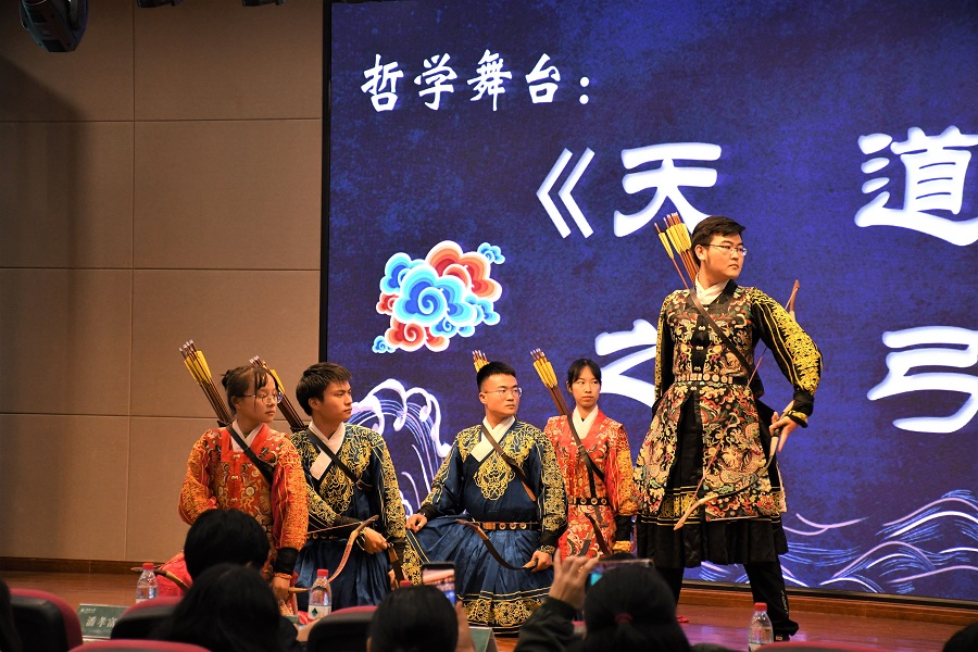 在哲学舞台环节,bevictor伟德射艺协会带来了射艺表演《天道之弓》。表演用开弓的各种不同状态展现了“天道损有余而补不足”的哲学思想,启迪师生尊重自然规律,追寻心灵的充实和思想的丰富。