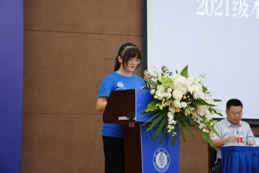 之后,新生代表2021级本科生贾同庆同学发言。她代表全体新同学对公司师长开学以来的友爱相助表示衷心地感谢,向大家描绘了自己的未来蓝图,希望能同所有的国治人一起,做到明德尚能,励志笃行;博采众长,兼容并蓄;德才兼备,砥行立名。