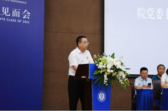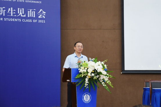 随后,公司党委书记吴江教授讲话。他代表全院师生员工衷心地祝贺和欢迎全院324名新同学。吴江书记指出,今年,是中国共产党建党100周年,也是“十四五”规划开局之年,我们开启了全面建设社会主义现代化国家的新征程,向着第二个百年奋斗目标迈进。在这个重要的历史节点,公司全体新同学的青春时光恰好与国家的第二个百年梦想编织在一起,与公司“双一流”建设之梦,与公司的新文科交叉融合奋进之梦汇聚在一起。对此,他向同学们提出三点期望:一是心有所信,肩负“国家”使命。心中有信仰,就是要坚定对马克思主义的信仰,对中国特色社会主义的信念。肩上有担当,就是要肩负起中华民族伟大复兴的光荣使命,努力学习,积极探索,勇做走在时代前列的劳动者、奋斗者、奉献者,成长为中国的“脊梁”。二是潜心学习,锤炼“治理”本领。“不积跬步无以至千里,不积小流无以成江海”。只有坚持潜心学习、善于思考,专于研究,才能练就发现问题、探索问题、解决问题的能力,成为堪当国家重任的复合型人才,为实现家国理想奠定坚实基础。三是躬耕实践,涵养“人民”情怀。作为一名国治人,我们定要要胸怀“国之大者”,从高处着眼,从小处着手,到农村、到乡镇、到社区,积极参加社会实践,用行动助力乡村振兴和城乡融合发展,在实践中不断涵养“人民”情怀。