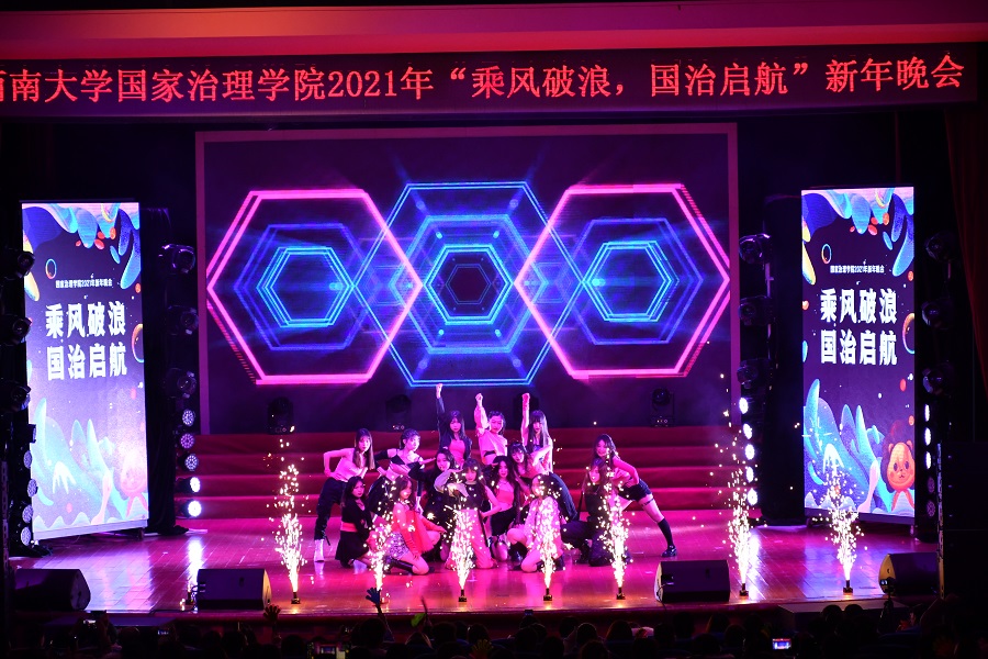 碧波逐海日,国治筑星光。就像恒星穿过亿万光年同极光确然相遇那样,爱的心跳似踢踏优雅的华尔兹般合拍。舞蹈《爱的华尔兹》将茫茫宇宙中的暖意越过寒冬融入会场,以这浪漫的鼓点,翻开晚会的第一篇章。随后曲风突转,Rap串烧《Hush,kong》携不羁与倔强,冲破卑谦面孔,以酒神的张狂,倾诉真实的内心。遏云歌响清,回雪舞腰轻。民舞《疆域》牵动无限风情,将观众辽阔的遐想牵入这一方舞台。新朋再逢旧友,情结冬日,浪漫邂逅。年度走秀《Sweet Winter》震撼登场。俊男靓女,火辣与冷艳完美结合,引发全场惊叹不断。灯光与激情火热碰撞,歌舞和Rap完美相遇,国风与流行巧妙融合,节目激情满溢,无不将氛围推至高潮。