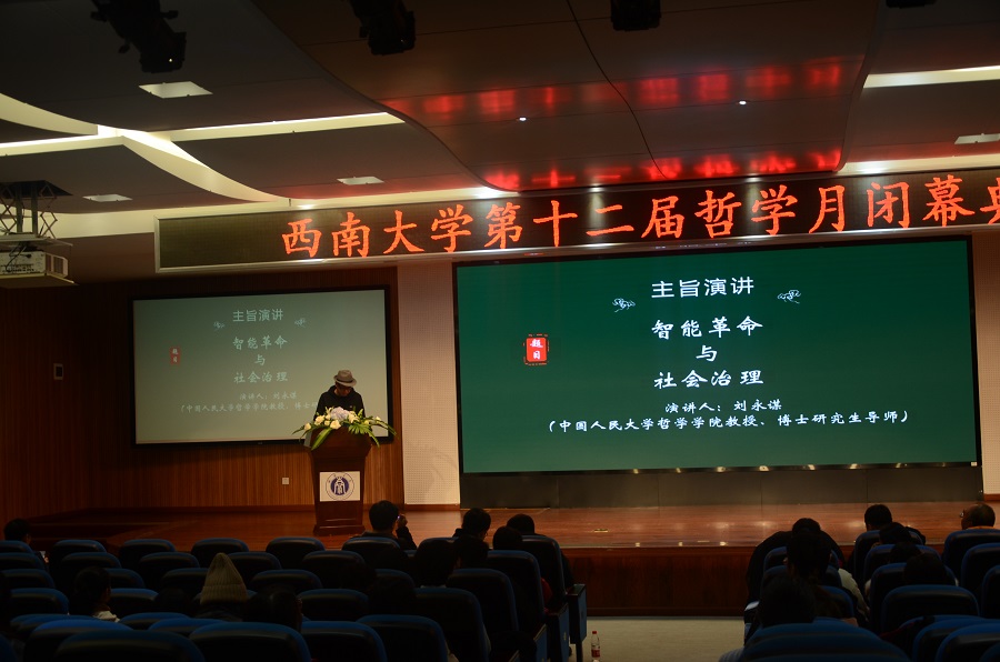 闭幕式伊始,刘永谋教授带来了发人深省的学术报告——《智能革命与社会治理》。他强调作为一个哲学工作者,应该把握好时代精神,而当今时代,显而易见,科技是哲学应该考量的一个重要话题。不论是健康码,还是区块链技术,都在疫情防控中大显身手。这也告诉我们:社会治理与科学技术之间的联系越来越紧密,我们已经逐步进入技术治理阶段,正在朝智能治理时代走去。继而他又提出一个令人深思的问题:“究竟应该如何看待智能治理?智能治理究竟是完美的天使,还是残忍的恶魔?究竟是无坚不摧的利器,还是装模作样的南郭先生?”近时,国务院发表《关于切实解决老年人运用智能技术困难的实施方案》,由此可见,智能治理在带给人们便捷高效的同时也带来了一些不可忽视的问题。随后,他通过“从技术治理到智能治理”、“远眺:乌托邦VS敌托邦”和“近看:反治理与风险”三个部分阐释了智能治理的利与弊。指出智能治理的趋势不可逆转,但同时前路漫漫,我们还有很多难题亟待解决。最后,他提出在推进智能治理的过程中需要“期待AI理想国,警惕AI机器国。智能治理势不可挡,我们应该审慎务实地推进智能治理,走出一条中国特色的社会主义智能治理之路。”防止被科学技术禁锢,成为“电子监狱”。刘教授的发言引导在座的广大师生深入思考,并就“新治理”提出自己独到的见解,体现出哲学与治理的难解难分。因此,在新时代,需要以新哲思来回应新治理。