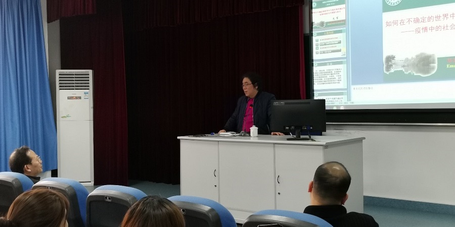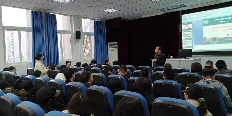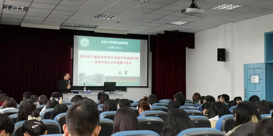 2020 年 12 月 5 日下午,华东师范大学社会发展公司经理、教授、博士生导师、国家级人才文军教授莅临公司“国家治理论坛”,开展《“如何在不确定的世界中寻找并创造确定性”——社会学的观察与思考》学术讲座。公司党委副书记王晖老师主持讲座,博士生导师王志章教授受邀评议,社会学与社会工作系师生到场聆听。