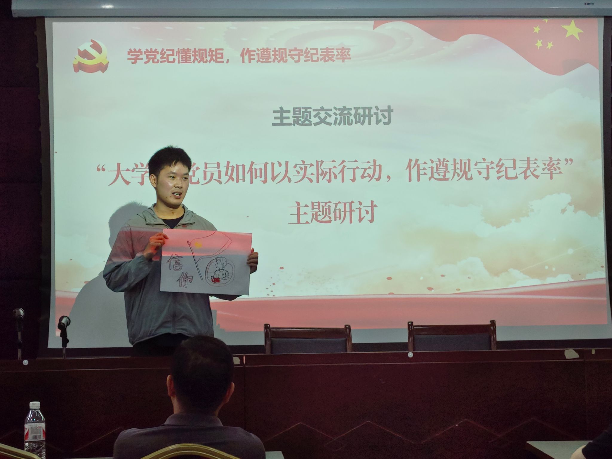 会上,大家共同学习了习近平总书记《论党的自我革命》篇目《严明党的组织纪律》,并逐条学习《中国共产党纪律处分条例》第九章至第十一章,通过典型案例学习,深刻认识到抓好组织纪律的重要性。在此基础上,支部党员就如何以实际行动作遵规守纪表率进行深入交流讨论绘画,各党小组代表以“信仰”“底线”“慎独”“自省”为主题进行分享。