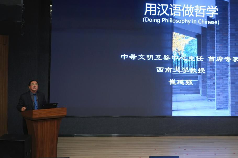 崔延强教授以“用汉语做哲学”为主题进行了主旨演讲。对于“中国无哲学”的观点,他提出了不同看法。他通过“中庸”、“唯天下至诚”等思想介绍了中国天人合一观,并与西方哲学进行对比,强调了文化互鉴的重要性。最后,他鼓励青年学习、运用哲学,追求美好生活。