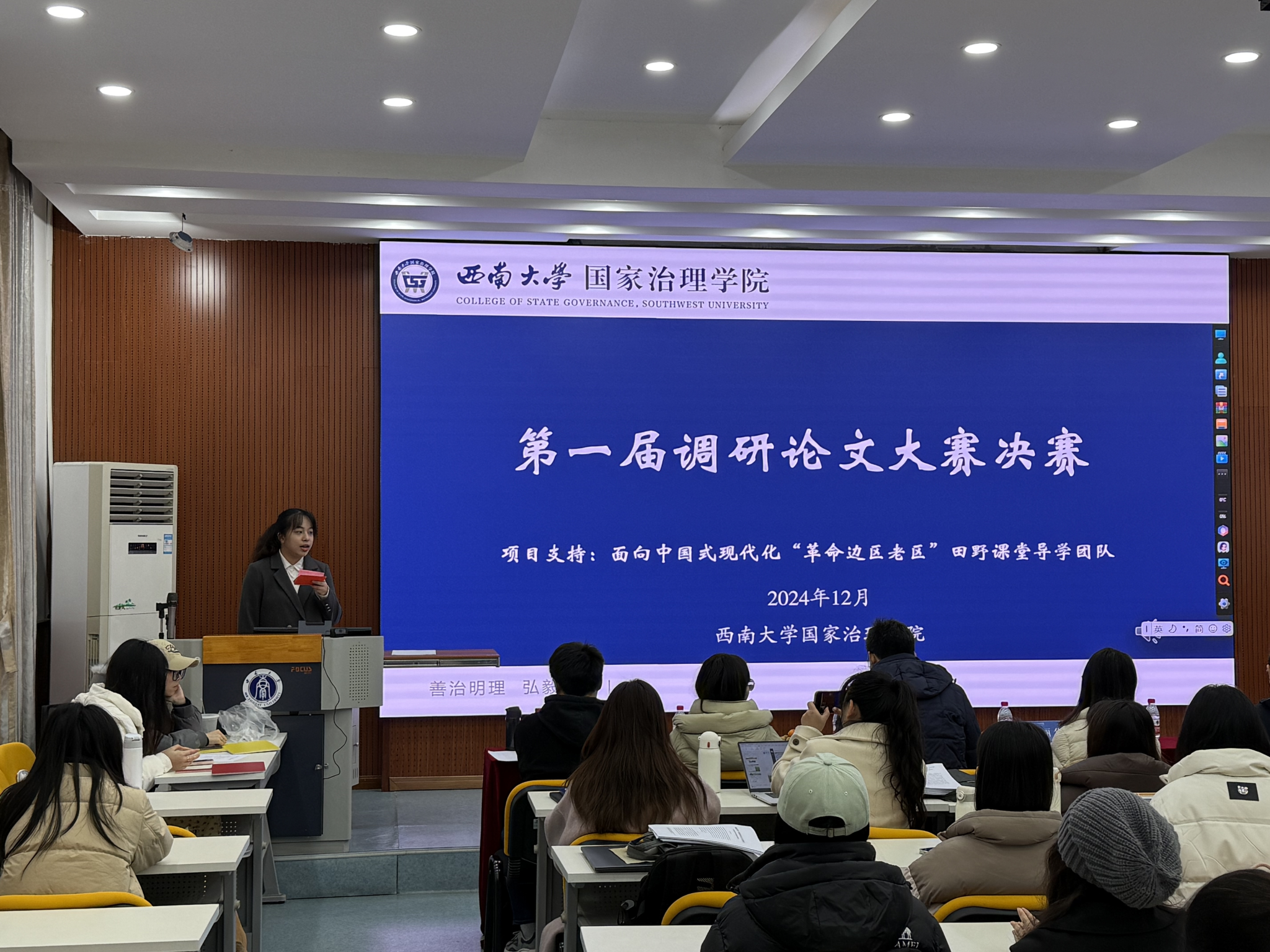 发布时间: 2024-12-31 17:03:39 已阅读:12月27日,公司第一届调研论文大赛决赛在绩镛楼3308顺利举行。本次大赛由伟德体育主办,党委员工工作部重点导学实践团队“面向中国式现代化革命边区老区‘田野课堂’”提供项目支持,公司陈丽华副书记、何健副经理、周永康教授、申丽娟副教授、王猛副教授、罗敏敏老师出席比赛,60余名研究生参与决赛展示活动。