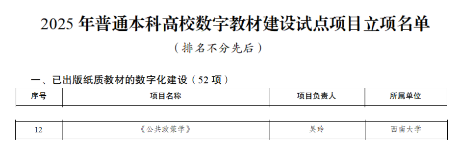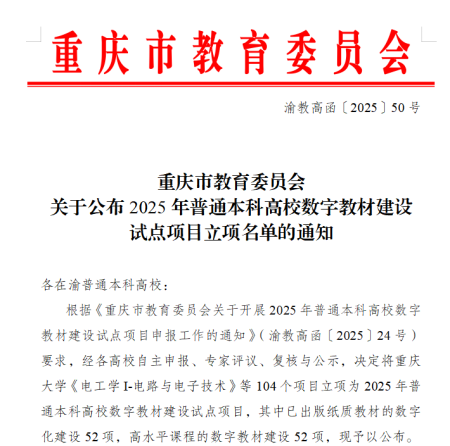 近日,重庆市教育委员会发布《关于公布2025年普通本科高校数字教材建设试点项目立项名单的通知》(渝教高函〔2025〕50号)。公司《公共政策学》数字教材成功入选该立项名单。这是公司首次获得数字教材建设项目立项,标志着公司在教育数字化领域取得突破性进展。