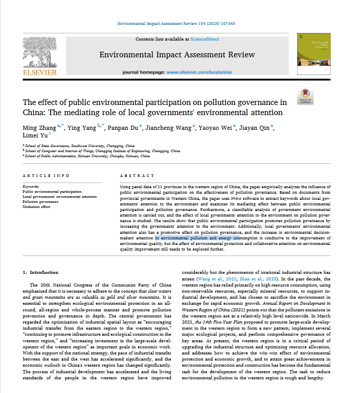 发布时间: 2024-01-11 11:16:15 已阅读:公司公共管理学系张明老师团队撰写的《The effect of public environmental participation on pollution governance in China: The mediating role of local governments' environmental attention》一文,2024年1月发表于中科院SSCI一区期刊《Environmental Impact Assessment Review》。该文以西部11个省级地区作为研究对象,运用面板数据,实证分析公众环境参与对治污效果的影响效应,并检验地方政府环境注意力在公众环境参与和治污效果间的中介效应。研究结果表明,公众环境参与通过提高政府环境注意力来促进治污效果的改善;从环境注意力的不同类型来看,地方政府提高对环境污染、能源消耗的关注有利于环境质量的改善,而环境保护注意力以及协同共治注意力对环境质量改善的效果仍待进一步挖掘。该文从政府和公众互动层面来考察地方政府环境治理,围绕该主题的系列研究以第一作者或通讯作者发表于《Technological Forecasting and Social Change》《Resources Policy》等中科院Top期刊。