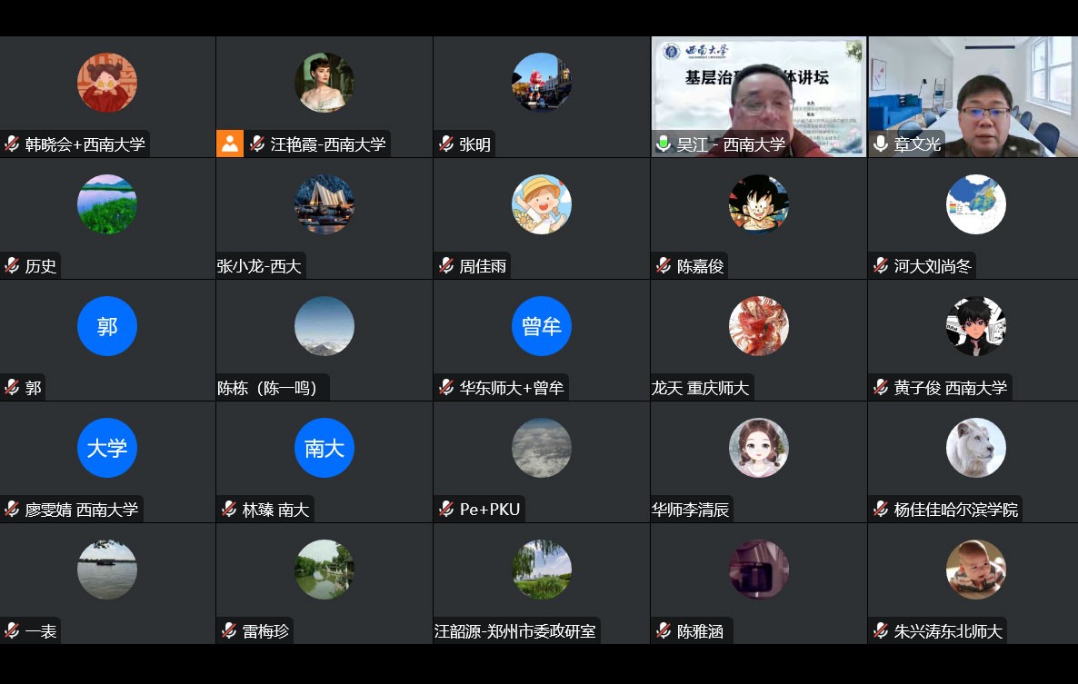 最后,吴江教授对章文光教授和所有参会的师生表示了衷心的感谢并对本次讲座进行了简要总结。他指出文光教授的报告和互动回应对“县乡村三级治理体系功能优化”问题的分享历史演变清晰、理论阐释深刻、政策解读准确、问题展示精准、实践样本丰富、政策建议可行、内容系统详实,有助于参会人员更加深刻理解党的二十大报告中有关基层治理体系和治理能力现代化的论述,也为系统开展县乡村三级治理体系相关问题明确了科学研究的视角与切口,提供了实践探索的思路与指南。