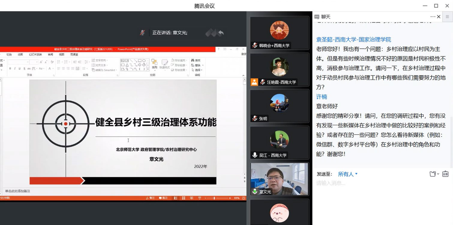 发布时间: 2022-12-11 11:51:33 已阅读:2022年12月9日上午,基层治理共同体讲坛系列讲座第四讲“健全县乡村三级治理体系功能”于线上顺利举行。此次讲座由北京师范大学政府管理公司经理章文光教授主讲,公司党委书记吴江教授主持,共有来自中国人民大学、中国社会科公司大学、南开大学、南京大学、武汉大学、中国公安大学、北京师范大学、华东师范大学、华东政法大学、华南理工大学、兰州大学、天津大学、四川大学、重庆大学、对外经贸大学、郑州大学、安徽大学、bevictor伟德等全国35所高校和郑州市委政研室及冀北民俗博物馆等地方单位的200余名专家学者和员工通过腾讯会议参加了讲座。
