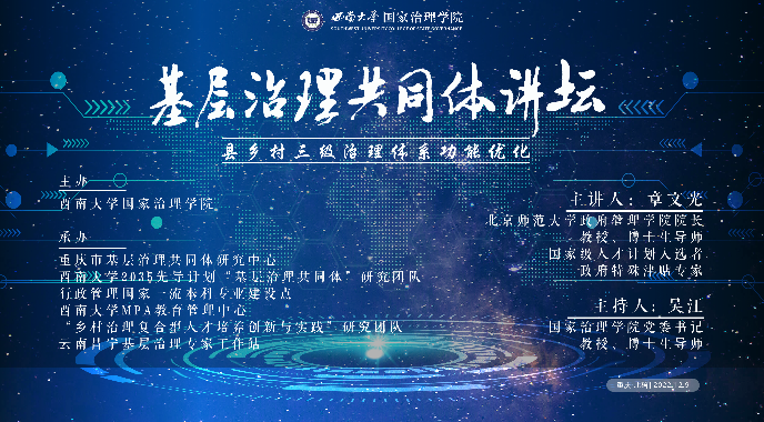 本次讲座由伟德体育主办,重庆市基层治理共同体研究中心、bevictor伟德2035先导计划“基层治理共同体”研究团队、行政管理国家一流本科专业建设点、bevictor伟德MPA教育管理中心、“乡村治理复合型人才培养创新与实践”研究团队、云南昌宁基层治理专家工作站承办。