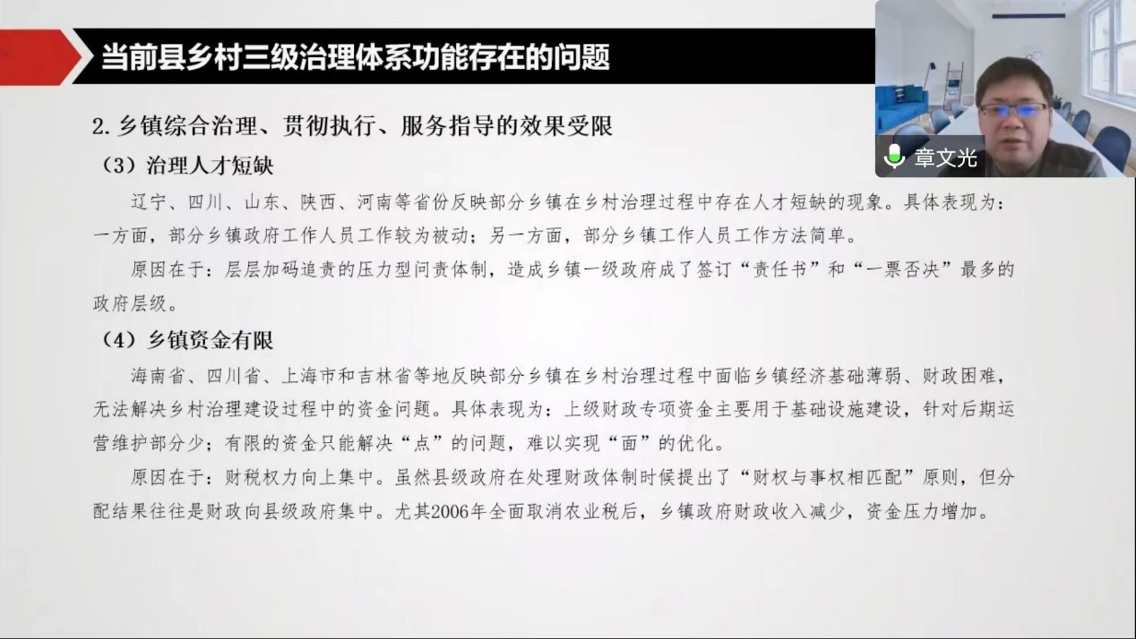 章文光教授分别从县乡村三级治理体系的形成演变、功能定位、当前问题、创新实践和政策建议五个方面展开此次分享。首先章文光教授从开创根据地(1921-1949)、探索建立新中国(1949-1978)、改革与完善乡村治理制度(1978-2012)、开启乡村治理新时代(2012至今)四个阶段梳理了乡村治理的历史渊源,阐释了县乡村三级治理体系的形成演变。接着,章教授分别从县级、乡镇、村级三方面解析了县乡村三级治理体系功能的定位,并进一步指出县级的功能定位是领导指挥、统筹规划、协调推进;乡镇的功能定位是综合治理、贯彻执行、服务指导;村级的功能定位是三治融合、联农带农、政策落地。在深入剖析了目前县乡村三级治理体系中存在的县级资金支持难保障、治理人才短缺、个别村级党组织软弱散、县乡村三级协同力度不强劲等系列问题后,章文光教授结合浙江衢州市的一体联动指挥体系和事项集成联办机制、广西武宜县的乡村集成共治工作机制、陕西留坝县的扶持村级资金互助等15个代表性案例进一步探讨了地方政府在县级、乡镇、村级以及三级联动实施的创新实践。最后,章文光教授提出了加强县级统筹协调,强化抓乡促村职能;推动乡镇増权增能,发挥承上启下作用;健全村级组织体系,提升具体执行效能等政策建议。