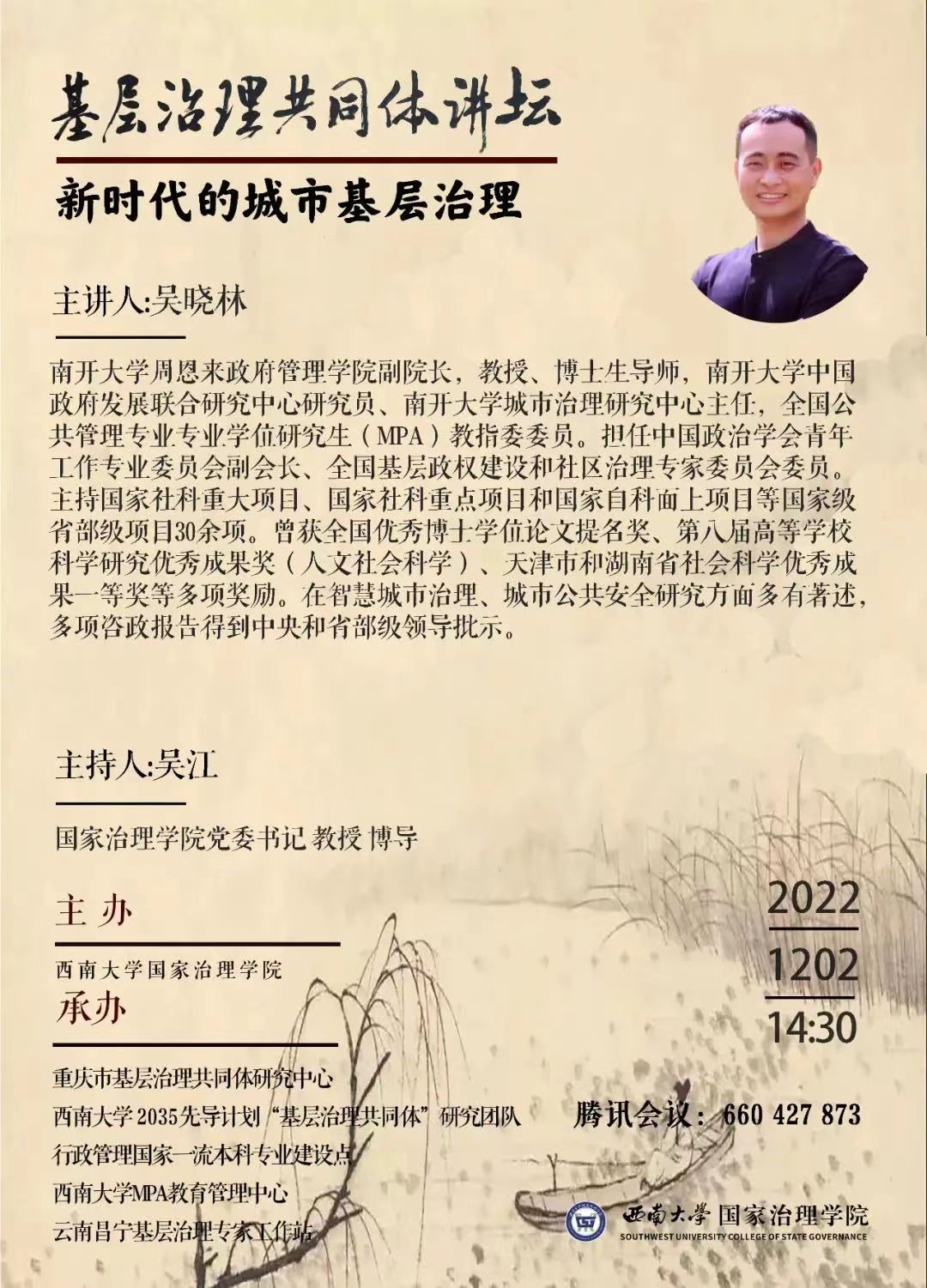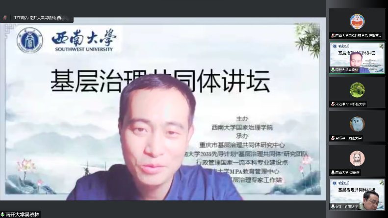 基层治理共同体讲坛第一讲有幸邀请到南开大学周恩来政府管理公司副经理、南开大学城市治理研究中心主任吴晓林教授做题为《新时代的城市基层治理》的学术报告。讲座由bevictor伟德公司党委书记吴江教授主持,共有来自人民大学、南开大学、中国科公司大学、上海交通大学、武汉大学、山东大学、四川大学、华东师范大学、中南大学、华中科技大学、安徽大学、上海财经大学、北京邮电大学、华南理工大学、天津大学、bevictor伟德等全国20多个高校和科研院所以及江苏省地震局、青岛市北区党建引领治理中心等地方单位的300余名专家学者和实务工作者通过“腾讯会议”参加了本次讲座。