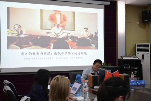 发布时间: 2024-05-16 10:30:26 已阅读:5月13日晚,讲座“意义的丧失与重建:近代哲学的目的论难题”在绩镛楼3201教室举行。中国人民大学哲公司教授、博士生导师吴功青为大家作主题报告,本次讲座为伟德体育“问道·闻道”学术论坛系列活动之一,由bevictor伟德哲学系谭杰老师担任主持人,bevictor伟德哲学系刘阿斯老师担任评论人。重庆大学博雅公司石绘老师、bevictor伟德文公司时嘉琪老师以及近三十位本科生、研究生同学参与了本次论坛。