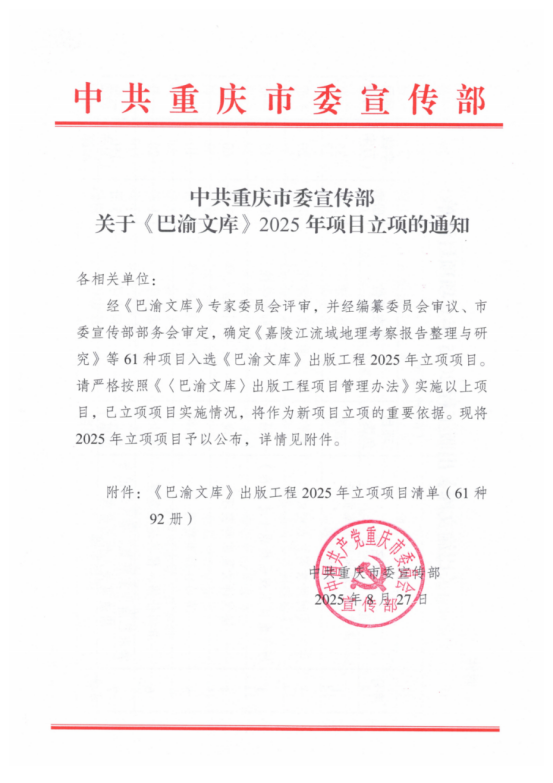 学术立院丨公司获批中共重庆市委宣传部《巴渝文库》研究项目暨重庆市社会科学规划特别委托项目资助2项