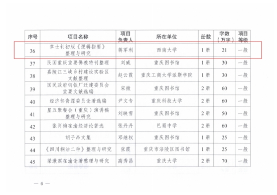 发布时间: 2025-09-24 10:04:01 已阅读:2025年8月,中共重庆市委宣传部公布了2025年度《巴渝文库》研究项目立项名单,公司解兴华老师主持“朱芾煌《法相辞典》整理与研究”重点项目及蒋军利老师主持“章士钊初版《逻辑指要》整理与研究”一般项目获得立项,并同时得到2025年度重庆市社会科学规划特别委托项目立项支持。