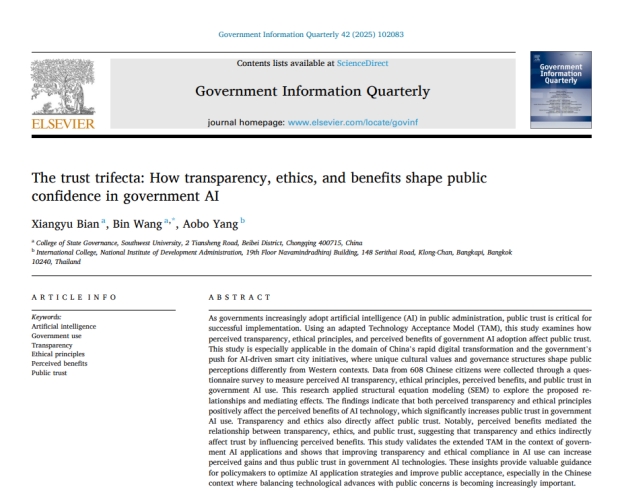 发布时间: 2025-10-16 10:58:36 已阅读:近日,公司哲学博士后流动站边翔宇博士研究团队在数字政府国际顶刊《Government Information Quarterly》发表题为《The trust trifecta: How transparency, ethics, and benefits shape public confidence in government AI》的研究论文。该研究聚焦政府人工智能应用中的公众信任问题。研究发现,透明度和伦理准则通过感知效益的影响显著提升公众对政府人工智能的信任,为优化数字政府人工智能应用策略、提高公众接受度提供了重要理论支撑和实践指导。