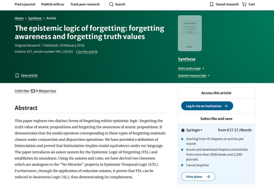 发布时间: 2026-02-27 15:29:06 已阅读:近日,公司哲学系郭美云教授与其博士生韩琳琳共同撰写的The epistemic logic of forgetting: forgetting awareness and forgetting truth values(关于遗忘的认知逻辑:遗忘觉知和遗忘真值)一文发表于中科院期刊分区人文学科哲学大类分区二区Top期刊Synthese。文章探讨了认知逻辑中两种不同的遗忘形式:遗忘原子命题的真值以及遗忘原子命题的觉知。文中表明,与这两种遗忘类型相对应的模态算子在合取和析取运算下保持封闭性。文中给出了互模拟的定义,并证明了在该语言下互模拟蕴含模态等价。该文给出了遗忘认知逻辑(FEL)的公理系统,并证明了其可靠性。利用这些公理和规则,得到了两个类似于时态认知逻辑(ETL)中“无奇迹”性质的定理。此外,通过应用归约公理,证明了FEL可归约到觉知逻辑(AL),从而证明了其完全性。
