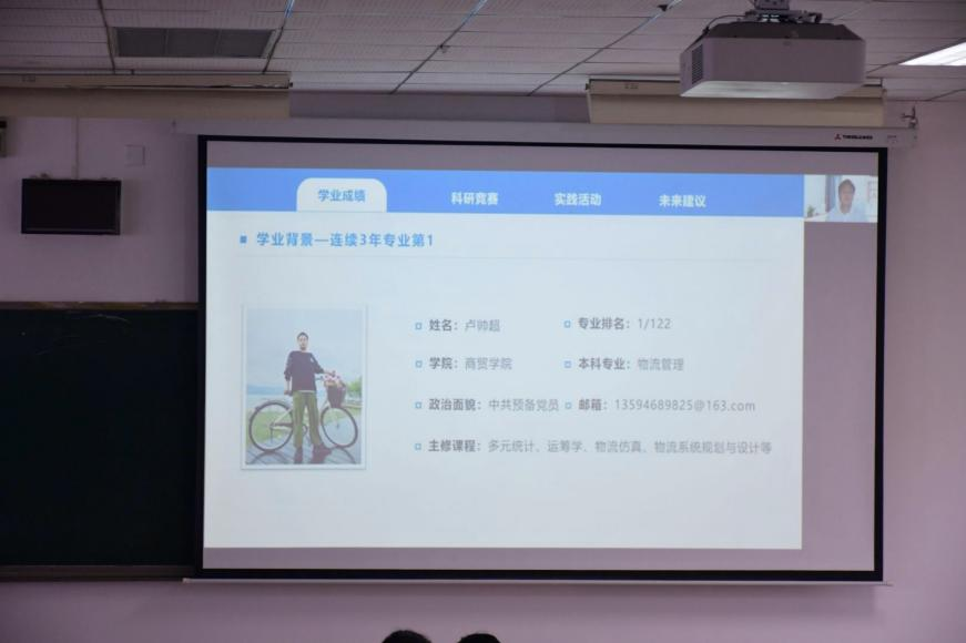 商贸公司卢帅超同学通过视频形式进行了远程分享。他以自己与国奖失之交臂的经历为切入点,建议大家要学会调整心态,更加注重成长过程而非单纯追求结果。同时,他提出了三点建议:一是要尽早做好职业规划;二是要保持自己的学习节奏,避免盲目内卷;三是要有针对性地进行努力。