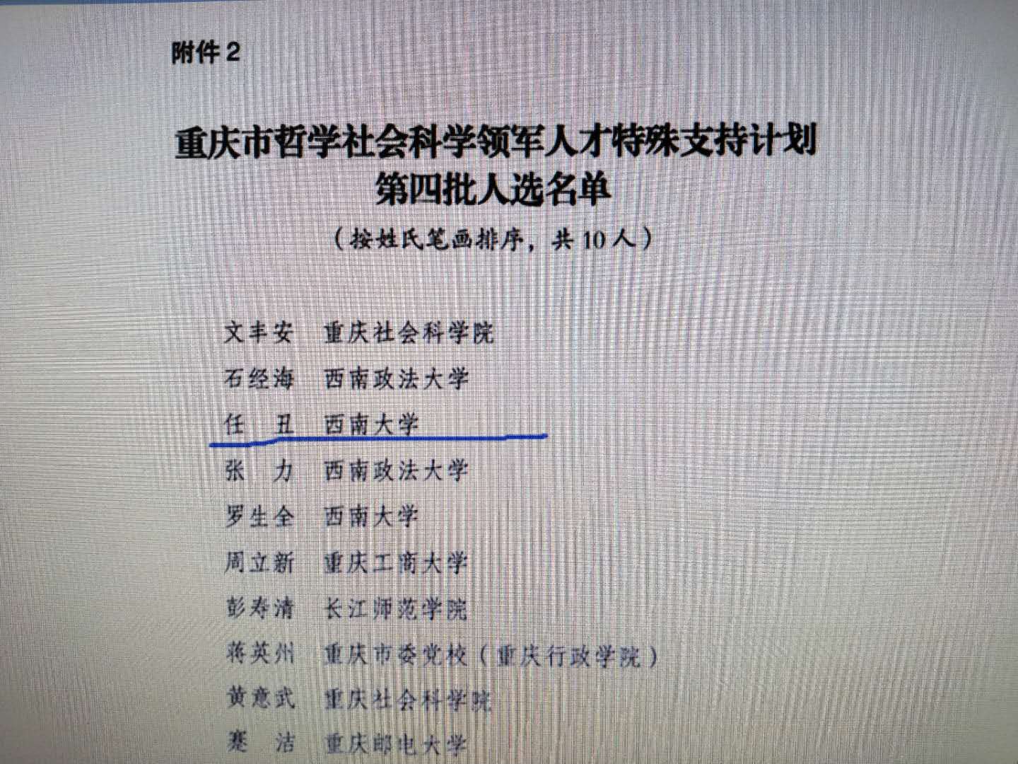 2018年12月27日,中共重庆市委组织部发布《中共重庆市委组织部关于印发重庆市高层次人才特殊支持计划第四批人选名单的通知》(渝委组﹝2018﹞187号),我系哲学一级学科负责人任丑教授成功入选“重庆市哲学社会科学领军人才特殊支持计划第四批人选”。这是公司2018年大力推进哲学团队建设的又一成绩。