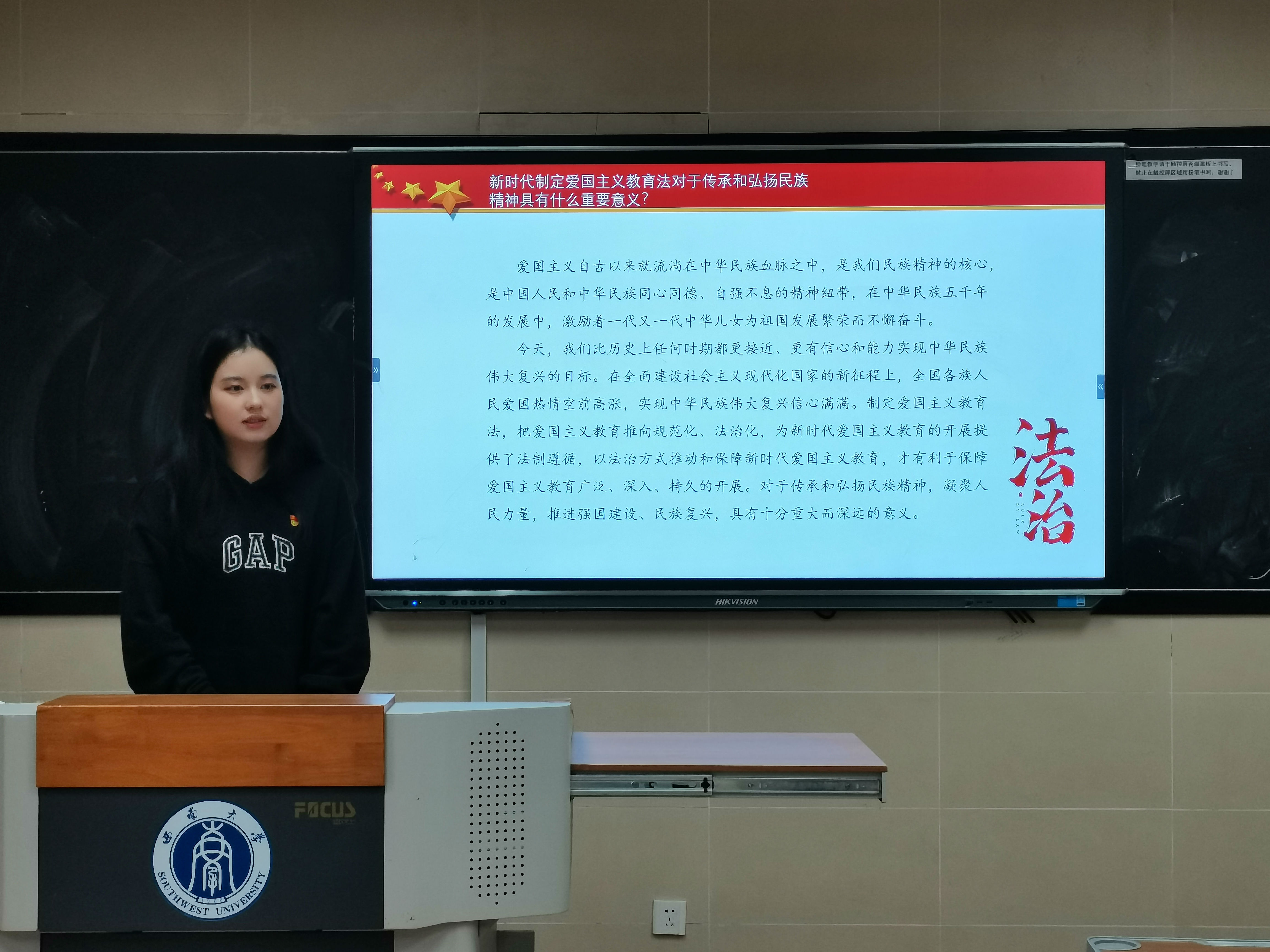 微党课讲授完毕后,支部成员围绕爱国主义主题展开深入学习。石燕玲同志领学习近平总书记在中共中央政治局第九次集体学习时的重要讲话精神,杨田媛同志带领支部成员学习《中华人民共和国爱国主义教育法》。支部全体成员表示,将深刻领悟爱国主义精神,将学习成果转化为理想信念,在日常生活中自觉践行爱国主义精神。