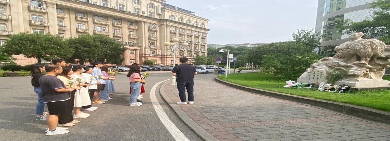 活动最后,大家来到了袁隆平院士的雕像前,全体成员肃立、默哀,表达对袁隆平院士的追思与敬意,并有序为袁隆平院士敬献鲜花,表达传承科学家精神,勇攀科学技术高峰的决心。
