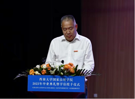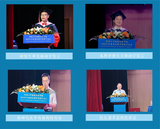 最后,经理潘孝富教授寄语,他代表全院师生员工向圆满完成学业的博士生、硕士生和本科生表示诚挚祝贺和祝愿,并寄语在场毕业生:格局决定品味;奋斗获得收获;实力赢得尊重。他祝愿毕业生们在星空之下,山海之间,向光而行,在新的征程上斗志昂扬、长风破浪,在青春的赛道上跑出佳绩!