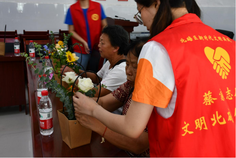 插花活动结束后,居民们提着自己的插花作品露出灿烂的笑容,纷纷合影留念留下许多精彩的瞬间。本次活动中,实践团成员向居民们介绍了家居插花手法,让居民们感受花艺之美,领略古典与现代的传承之美,感悟生活的自然真谛。居民们互相赠送鲜花与祝福,共同享受鲜花盛开的美丽瞬间。