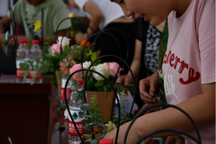 活动开始,公司“三下乡”社会实践团成员游璐介绍了插花艺术的基本知识、插花造型、器具、色彩应用及花的品种等内容。随后游璐同学向居民们展示了插花的过程并说明需要注意的事项,居民们认真聆听,为接下来动手插花做好准备。掌握基本方法后,居民们选取了自己喜欢的花材,在现场实践团成员的帮助下创作自己的插花作品,经过不断的尝试和实践,一盆盆错落有致、生机盎然、创意十足的插花作品展现在大家眼前,令人赏心悦目。
