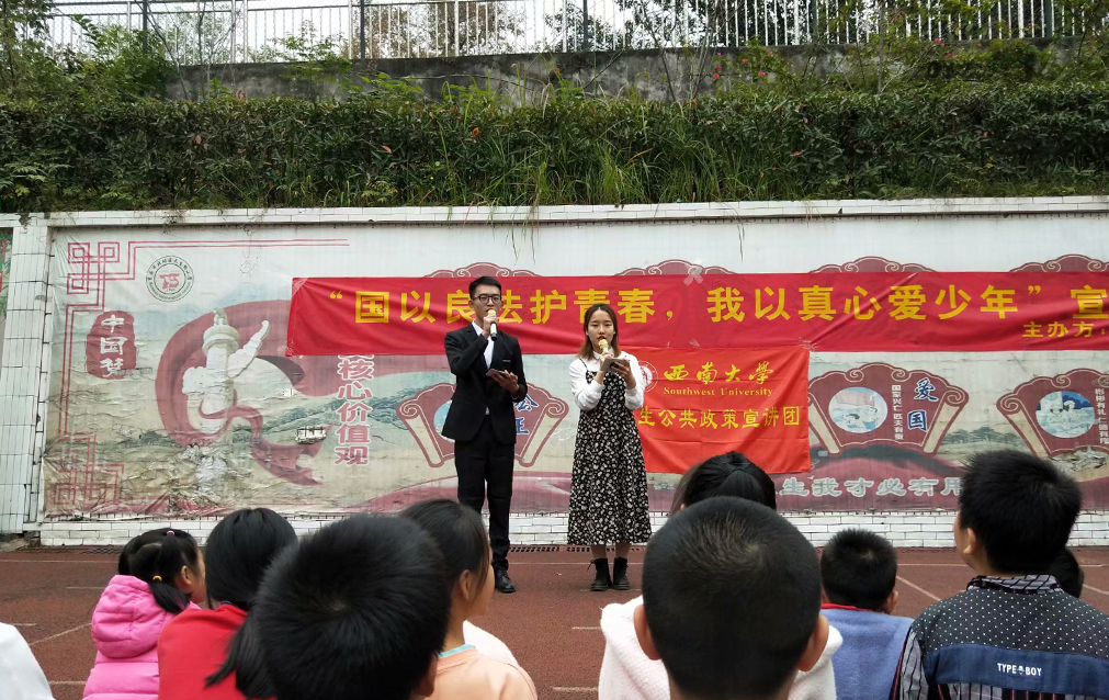 杲杲冬日光,明暖真可爱。随着信息化时代的发展,近年来越来越多未成年人伤害事件进入公众视野。为了提高公众对新修订未成年人保护法的理解,增强未成年人的自我保护意识以及运用法律的能力,bevictor伟德员工公共政策宣讲团(以下简称“公宣团”)联合bevictor伟德宣政在线网络文化工作站于2020年11月20日13:55在天生桥小学举办“国以良法护青春,我以真心爱少年”主题宣讲活动。在和煦的冬日暖阳下,主持人雷晓妍、万庆丰向天生桥小学的小朋友们详细介绍了本次活动的背景、目的并随后宣布本次活动正式开始。
