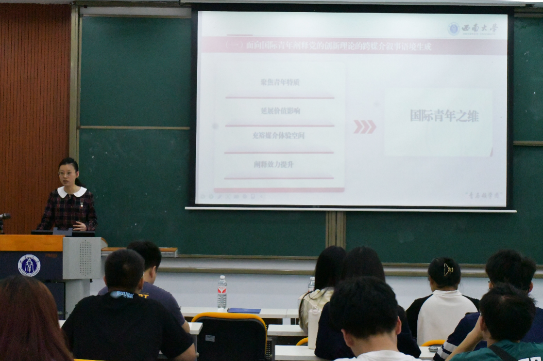 青马领学团代表史家宁围绕“文明的投影:新时代党的创新理论何以感召国际青年”,从“面向国际青年阐释党的创新理论的跨媒介叙事语境生成”、“跨媒介叙事之变”和“跨媒介叙事升维”三个方面展开了讲解。她指出,要通过创新与优化叙事体系、全媒体合力靶向输出和策略性激发文本生成的方式实现跨媒介叙事升维。她鼓励作为青年马克思主义者,我们要合力描述关于中国共产党治国理政的故事,让国际视野中文明的交流互鉴更加开放包容。