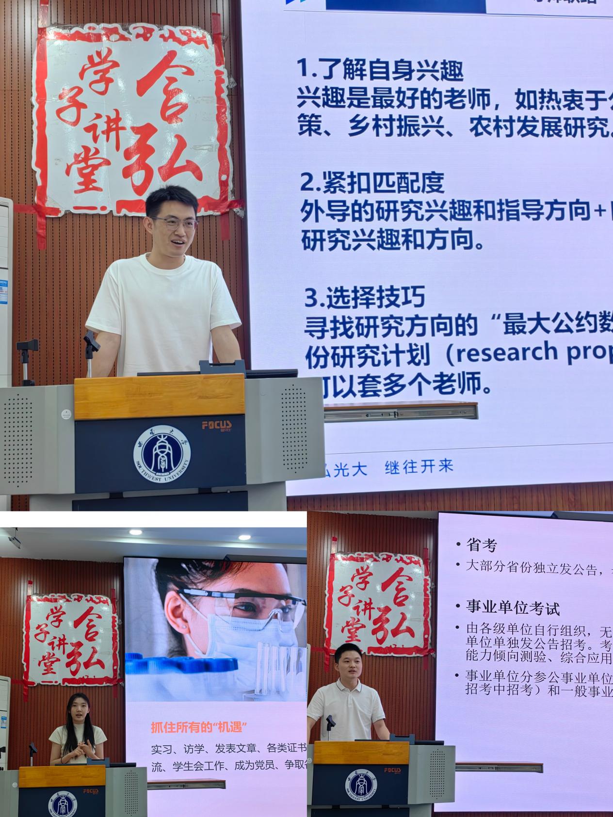 分享互动环节,2022 级公共政策专业杨平同学围绕申博主题进行经验分享。他详细介绍导师信息的获取途径、沟通技巧等内容,强调了发送研究计划的重要性,从时间流程上介绍了不同月份在申博上需要做的工作以及公派留学的具体过程。2022级社会工作专业王洁为同学以公务员及事业单位考试为核心主题,他首先梳理了国考、省考及事业单位考试的时间安排及报考条件与招录要求。提出刷题训练、专项突破、现时模拟等训练技巧,在面试环节上,要了解不同面试的题型与考察重点,保持积极心态,强化开口表达训练,并注重语速语调、面部表情、肢体语言等细节,实现自信流畅的考场呈现。2022 级社会工作专业赵培玉珠同学结合个人成长经历,围绕实习实践、访学交流、学术成果发表、公司活动参与及学术论坛研讨等多个维度,分享了求职经验。