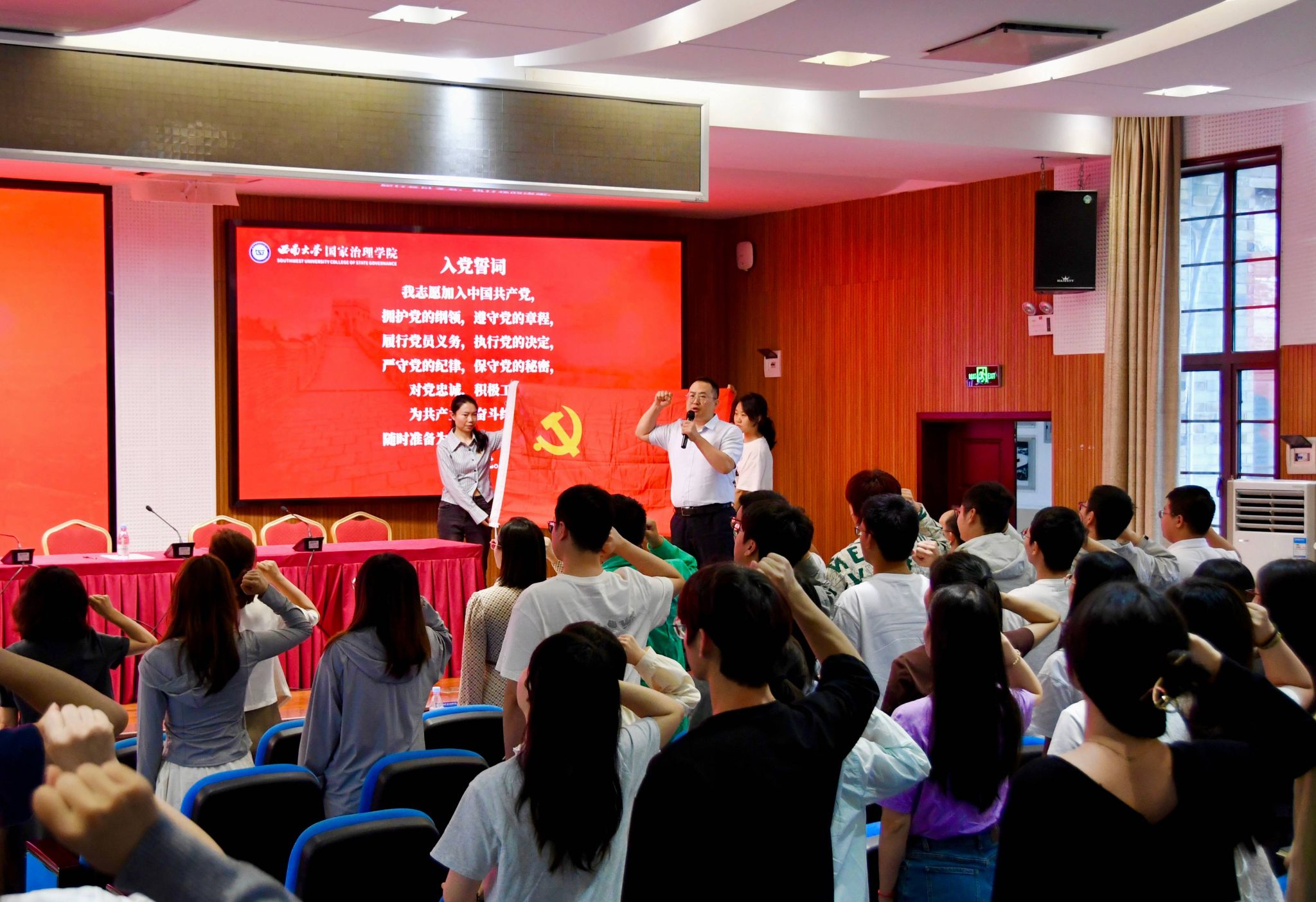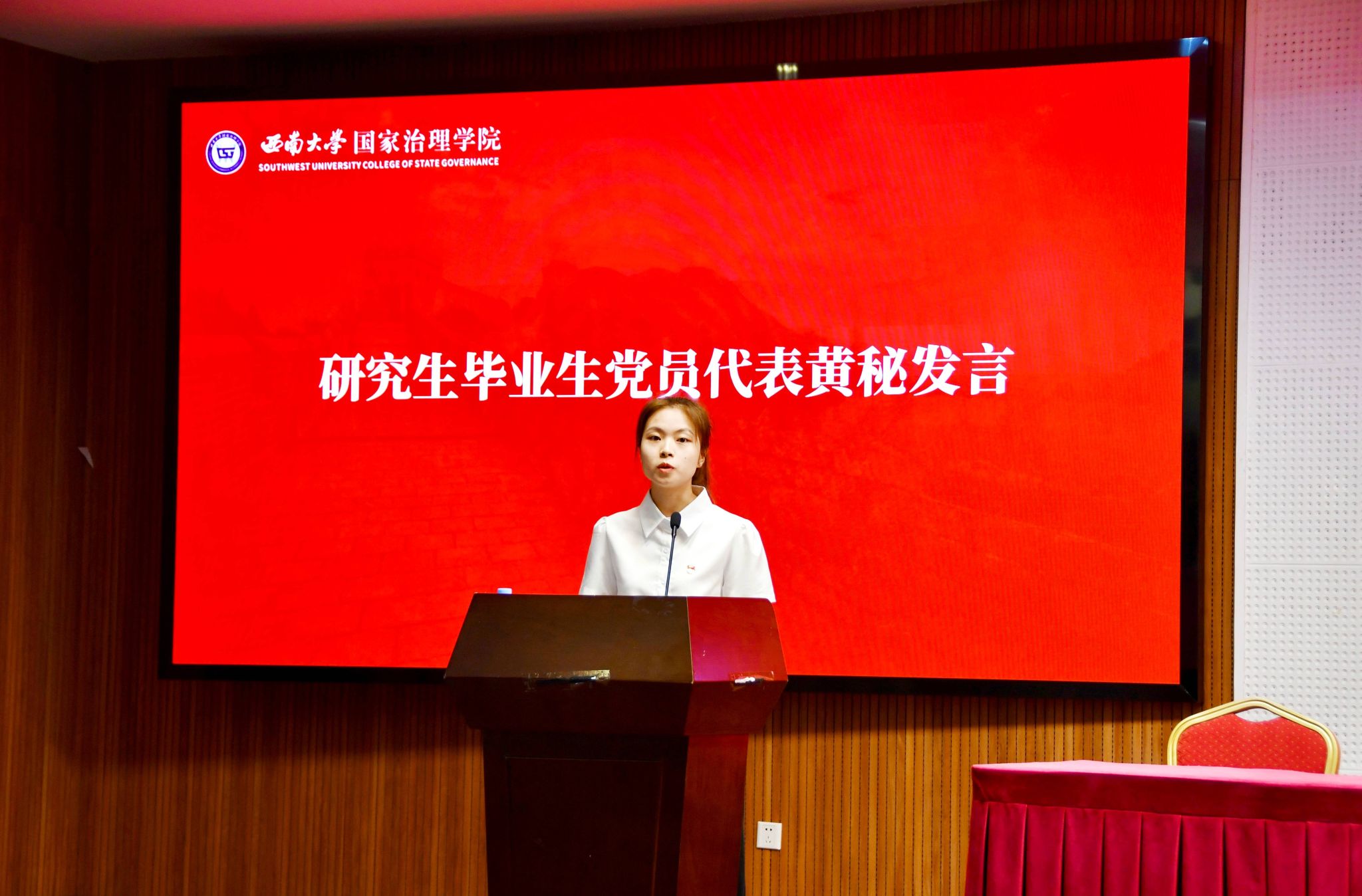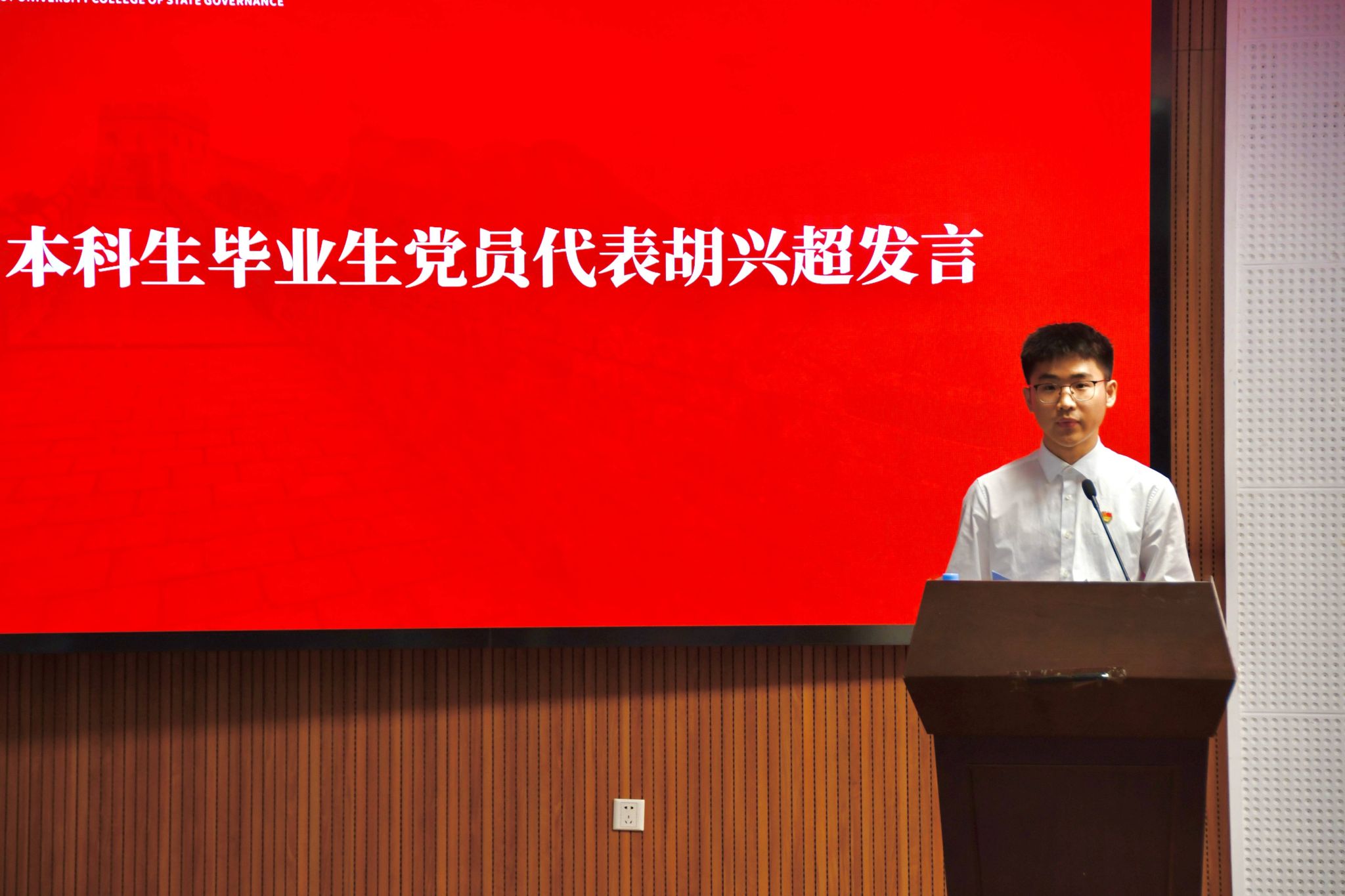 毕业生党员代表黄秘、胡兴超在发言中表示,将不负党组织嘱托,不忘初心,砥砺前行,在今后的人生征途中努力为党旗增辉、为母校添彩。